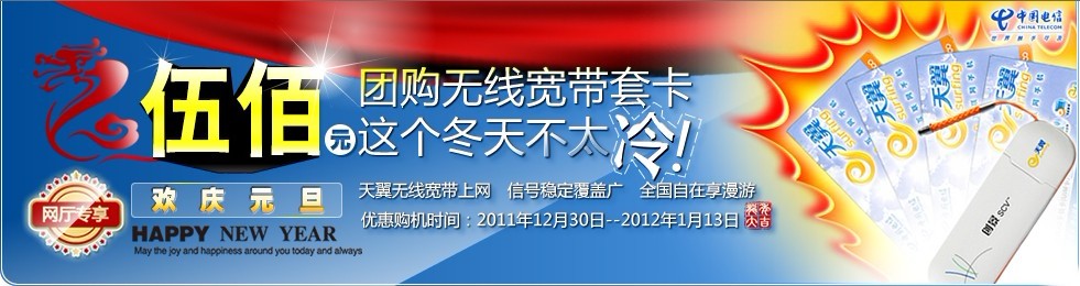 广州电信网厅专享,低价限量团购广东省内1G无线宽带年卡,仅需500元,即可享受随时随地、随心所欲自由上网。 优惠购买时间:2011年12月30日-2012年1月13日 天翼无线宽带上网,信号稳定覆盖广,全国自在享漫 ...